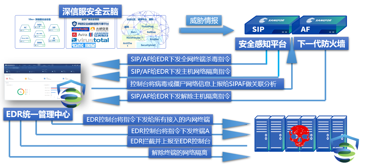 端点软件支持防病毒功能、入侵防御功能、防火墙隔离功能、数据信息采集上报、一键处置等。深信服的 EDR 产品也支持与 AC、SIP、AF、SOC 产品的联动协同响应,形成新一代的安全防护体系。