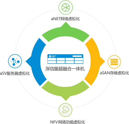 超融合架构解决方案是通过超融合一体机或通用X86服务器,实现服务器虚拟化、存储虚拟化以及网络虚拟化功能的平台性整合。深信服为用户提供整体数据中心的超融合方案,可实现云数据中心和软件定义数据中心SDDC的基础架构建设。